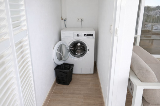 The living area features an open-plan design and connects directly to the high-quality, fully equipped kitchen. From here, there is access to the spacious terrace with direct harbor views. The terrace also includes a separate storage room.
