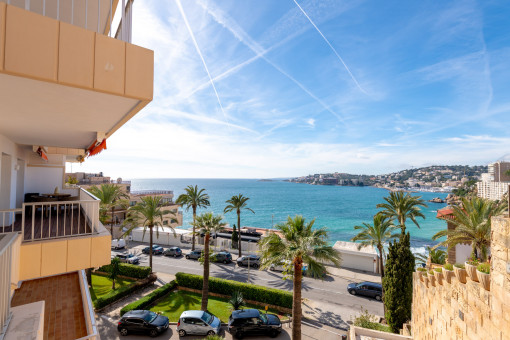 Located directly on the beach of Cala Major, this fully renovated apartment presents itself as a true gem with spectacular panoramic sea views.