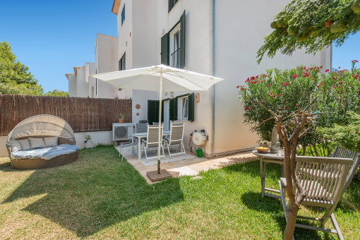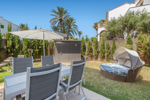 From the kitchen, you have access to the lovingly planted, approx. 200 m² garden with its tasteful teak outdoor furniture under an electrically operated awning. An outdoor shower and a Biohort hut provide additional amenities. An opaque fence and a lockable gate ensure privacy in this property.