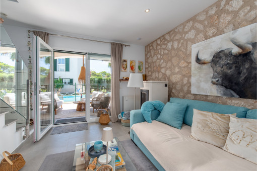 The property is accessed via a few steps that lead to the modern 14 sqm entrance area, which also serves as a covered terrace. The first floor consists of a fully furnished living/dining area, which radiates cosiness thanks to its natural stone wall. In winter, the pellet stove provides pleasant warmth. The open-plan kitchen with cooking island (Nolte brand) is equipped with Siemens appliances, a washing machine (Miele brand) and a side-by-side refrigerator. A guest WC with towel radiator and a small storage room under the stairs add to the comfort of this living level.