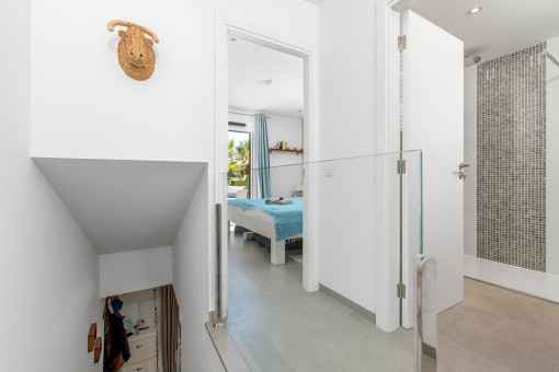On the second floor there are 2 bright double bedrooms with generous fitted wardrobes and natural stone walls as well as a spacious bathroom with walk-in shower and natural stone shelves. One of these rooms has access to a 14 sqm balcony with views of the pool area and the large palm trees.
