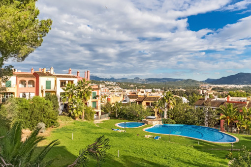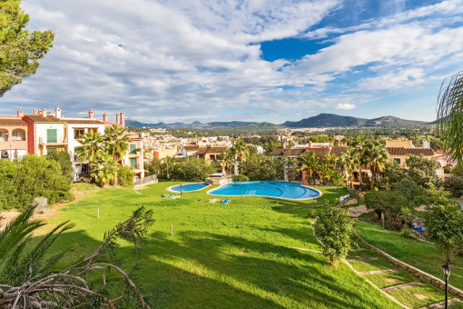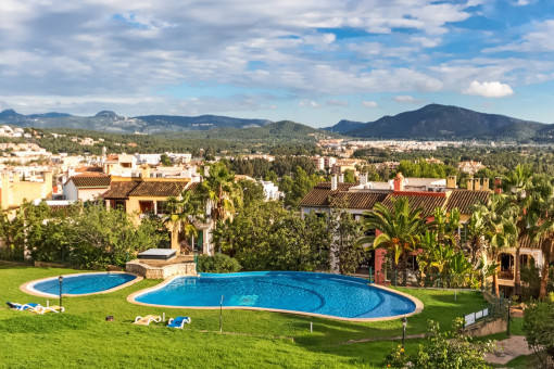 This apartment is located in a well-maintained residential community in Santa Ponsa, featuring two communal pools and beautifully landscaped garden areas. It is designed in a Mediterranean style and is offered furnished for long-term rent.
