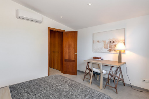 The finca with its light-flooded and spacious living/dining area with high ceilings and fireplace is entered via a decoratively designed entrance area. An open, fully equipped kitchen with cooking island leaves nothing to be desired and invites you to create Mediterranean dishes. A rustic solid wood table provides plenty of space for a large family and friends to eat and celebrate.