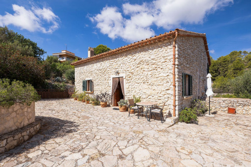 The property combines traditional Mallorcan architecture in natural stone with high ceilings, exposed wooden beams, and a warm, inviting atmosphere – creating a harmonious blend of rustic charm and Mediterranean elegance.