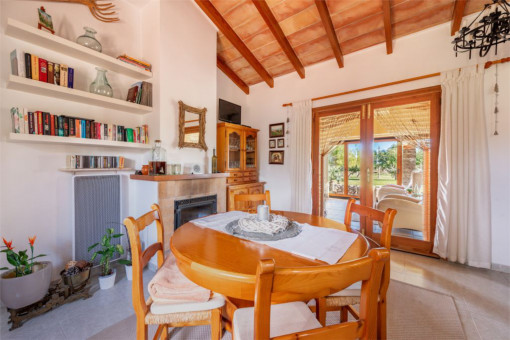 In addition to the living room, the finca has two bedrooms and two bathrooms, a kitchen and pantry as well as a separate garage - compact, pleasantly organized and suitable for everyday use. The fully equipped kitchen with all appliances and a well-structured pantry allow for relaxed cooking. Built-in cupboards in the rooms ensure order and clear lines. Infrared heating, a wood-burning stove in the living area and air conditioning units in the bedrooms provide reliable support throughout the seasons. Teak Persianas give the house a special touch. The light-flooded conservatory forms the emotional center - a room that can be opened up and literally brings the summer inside.