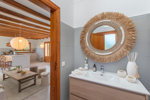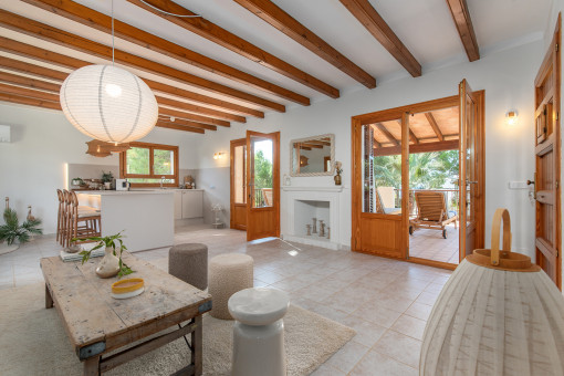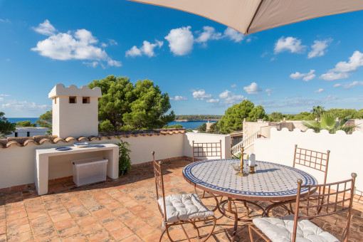 The upper floor impresses with a light-flooded living and dining area with a fireplace and a modern, integrated kitchen. From here, you can access a large covered terrace with partial sea views. The perfect place to get together.