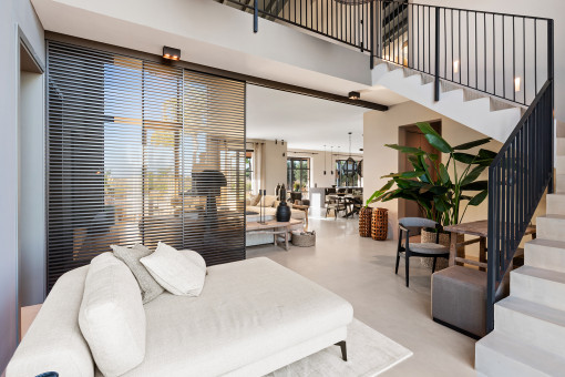 On the upper floor, there is an open gallery with sea views, which is designed as an additional living area with a gas fireplace. This level is complemented by two further bedrooms, a bathroom and a spacious master suite with a free-standing bathtub, dressing area and private terrace.