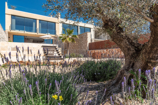 Floor-to-ceiling window fronts harmoniously connect the indoor and outdoor areas and open up breathtaking views of the sea and the island of Cabrera from the living area. The elegantly designed outdoor area impresses with Mediterranean plants, spacious terraces and a 21 sqm high-flow saltwater pool with waterfall and outdoor shower.
